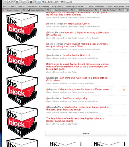His first tweet mentioned that he could see the woman in front of him nursing: “the lady in front of me is breastfeeding her baby at a Dodger game. No shame.” We could give him the benefit of the doubt and assume he meant, “no shame in that- good for her” but really what he meant was, “has she no shame?”